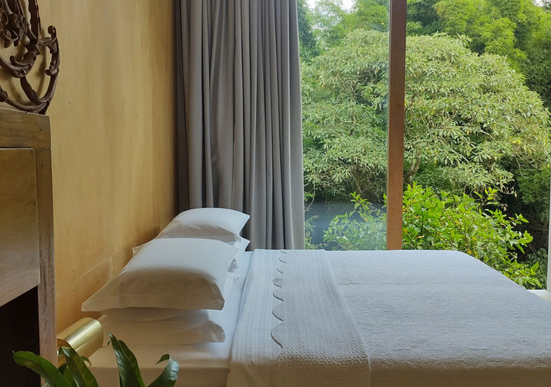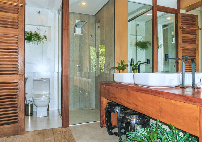 Situada no nível do jardim, a suíte possui uma pequena área externa com plantas e é bastante intimista e privativa.